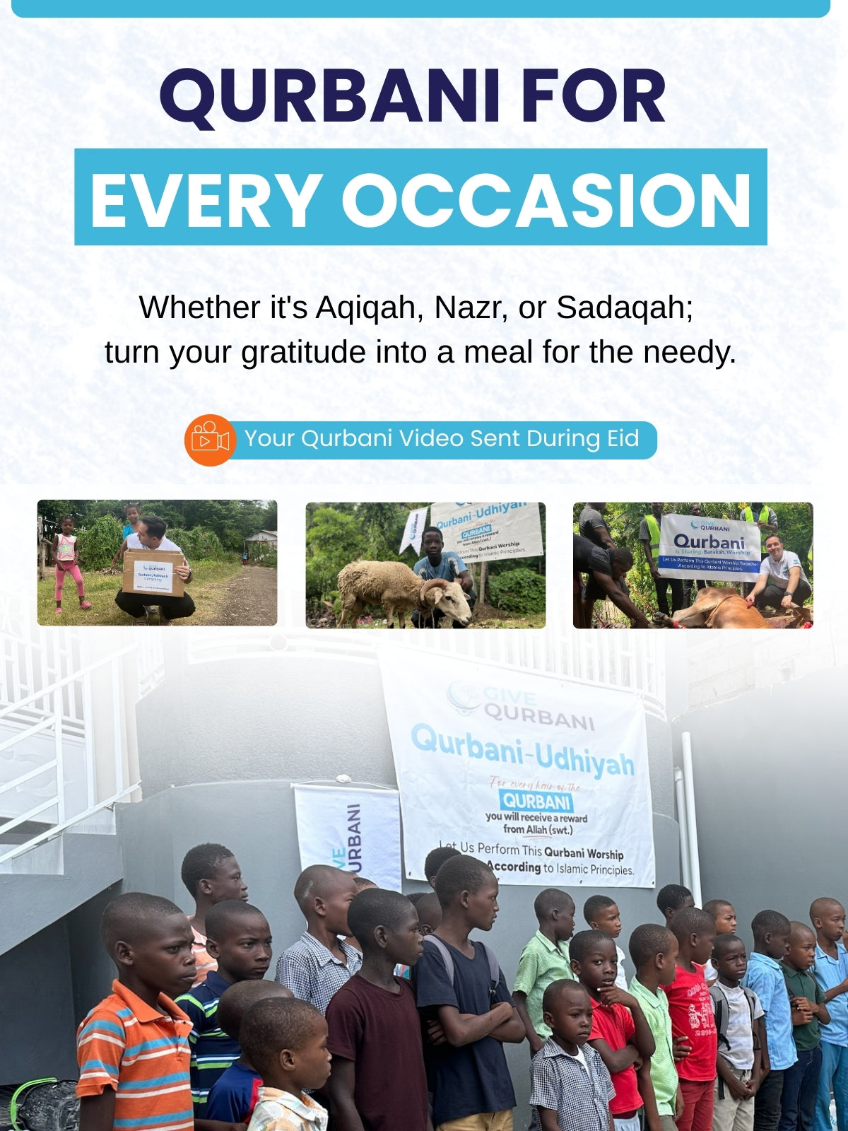 Your sacrifice is performed strictly according to Islamic principles, under the supervision of Imams and trained professional butchers.